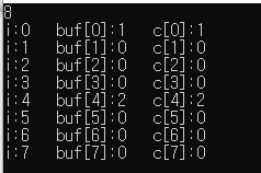 printf("i:%d buf[%d]:%d c[%d]:%d\n",i, i, buf[i],i,c[i]);