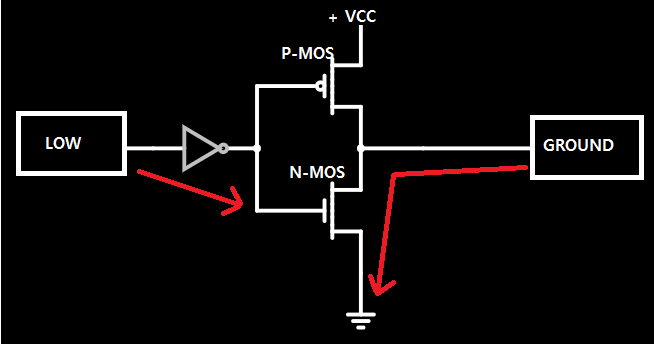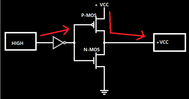 내부적으로는 위와같은 형태로 되어있습니다. 쉽게 생각하면 N-MOS와 P-MOS는 전기 스위치라고 보면 되고 N-MOS는 1이면 켜지고 P-MOS는 0이면 켜집니다.