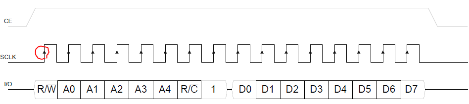 빨강 동그라미를 보면 클럭이 LOW에서 HIGH가 됩니다. 그때 DS1302는 I/O핀의 상태를 읽습니다. 클럭에 화살표가 있는 방향에서 DS1302가 데이터를 READ한다고 보면 됩니다. (MCU : Write, DS1302 : Read)
