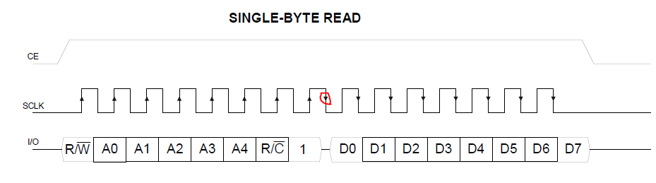그림5는 READ 파형입니다. 앞에클럭8개는 write때랑 방식이 같습니다. 빨강동그라미를 보면 READ는 클럭이 HIGH에서 LOW로 될 때 DS1302가 write합니다. (MCU : Read, DS1302 : Write)