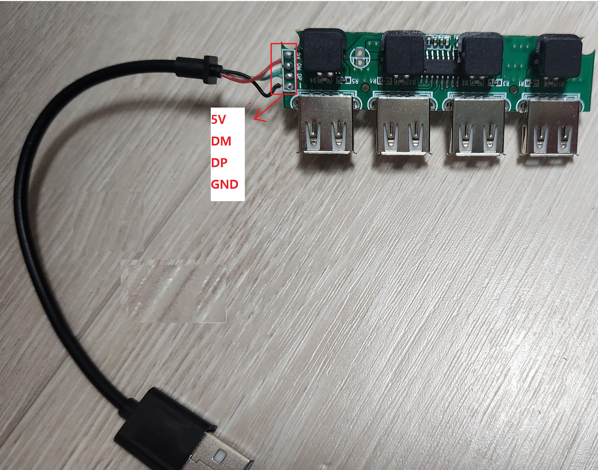 아래의 사진은 USB 2.0 허브입니다.선이 4가닥있는것을 볼 수 있습니다. 그래서 통신파형을 측정할때는 D+,D-,GND를 측정하면 됩니다.