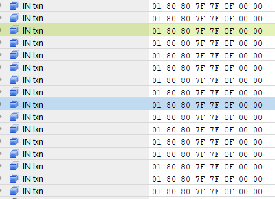 해당 디바이스에서 아무것도 눌리지 않았을때 주기적으로 01 80 80 7F 7F 0F 00 00이 옵니다.