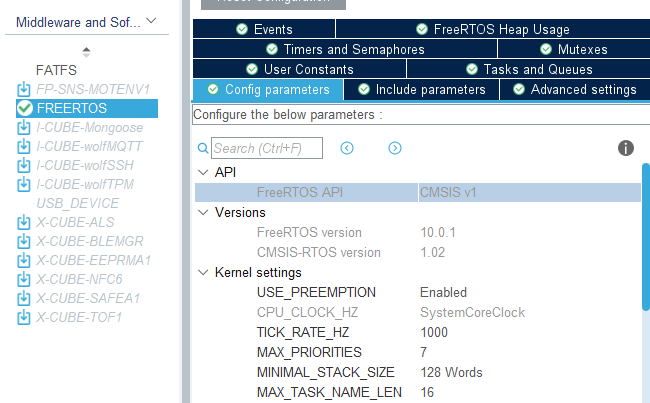 먼저 프로젝트를 만들고 FREERTOS를 활성화해줘야합니다. FREERTOS를 선택하면 Interface를 선택하라고 나옵니다. CMSIS V1과 CMSIS V2의 차이는 CMSIS 인터페이스에서 사용하는 함수들의 차이인데 여기서는 CMSIS 인터페이스를 사용하지않고 FreeRTOS 인터페이스를 사용합니다. 예를들어 테스크를 만들때 FreeRTOS는 xTaskCreate함수를 사용하고 CMSIS는 osThreadCreate함수를 사용합니다. 사실 osThreadCreate함수의 코드를보면 결국에는 xTaskCreate함수를 호출합니다. 결국에는 xTaskCreate함수를 래핑해서 osThreadCreate함수를 만든겁니다.