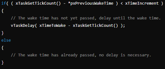 vTaskDelayUntil함수에서는 아래의 코드처럼 (현재틱 -xLastWakeTime) < 딜레이시간을 해서 vTaskDelay 시킵니다.