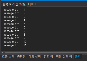 일반적으로 디버깅을위해서 Console.WriteLine함수를 많이 사용합니다. 기본적으로 이 함수를 사용하면 visual studio의 output탭에 메세지가 표시됩니다.