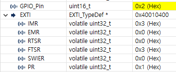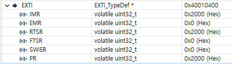 그리고 디버그모드로 SWIER(Software Interrupt Event Register)레지스터를 0x2000로 설정하면 인터럽트가 발생되는것을 확인할수있습니다.