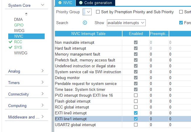 3. System Core -> NVIC로가서 EXTI0, EXTI1을 Enabled 해주고 코드제너레이터를 합니다.