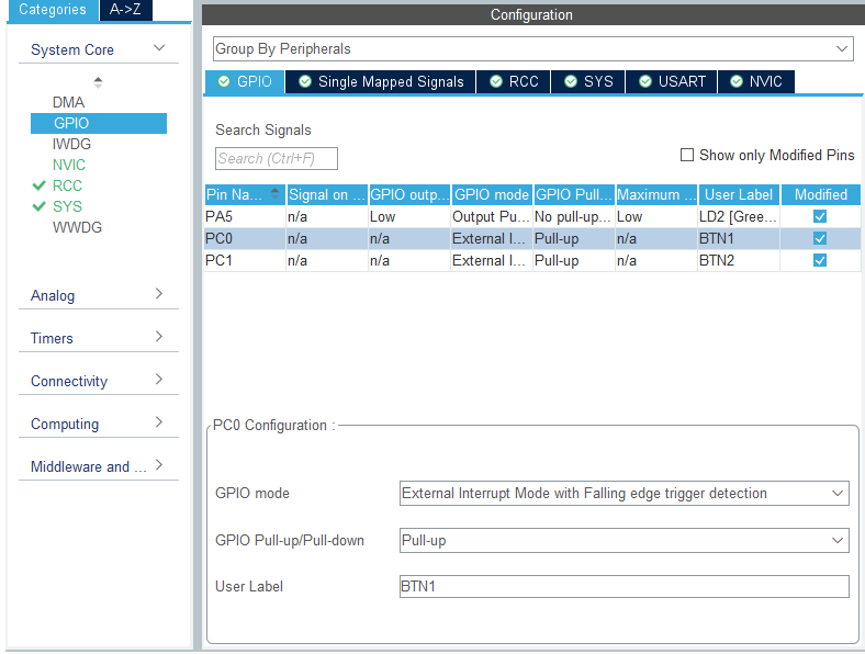 1. 사용할핀을 인터럽트 설정합니다. (GPIO_EXTI0) 여기서는 EXTI0, EXTI1을 설정합니다.