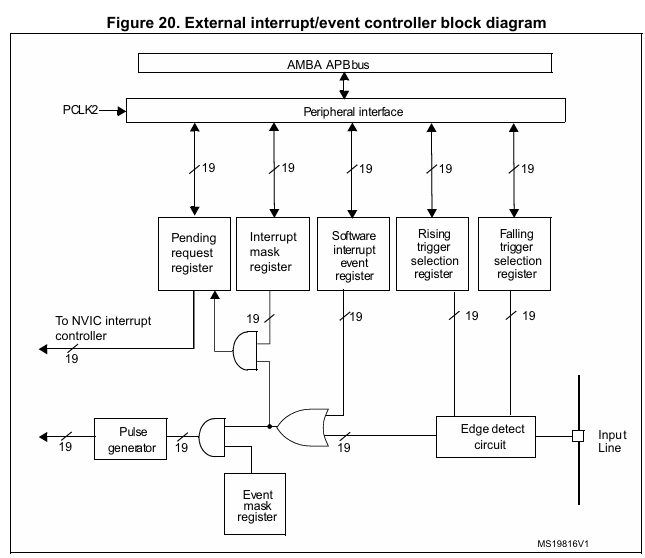 먼저 데이터시트에 있는 외부인터럽트 블록도를 보겠습니다. (STM32F103RB)