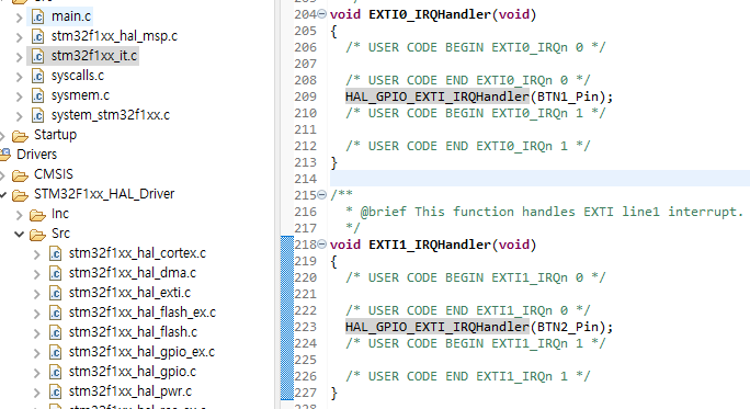 4. stm32f1xx_it.c에 인터럽트핸들러 두개가 생겼습니다. 공통내용인 HAL_GPIO_EXTI_IRQHandler를 따라가보면 최종적으로 HAL_GPIO_EXTI_CAllback을 호출합니다.