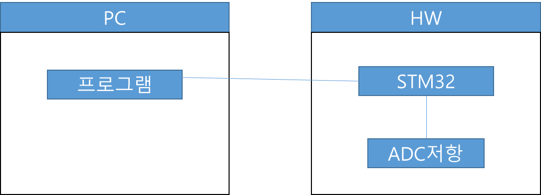 간단히 나타내면 아래의 그림과 같습니다. STM32로 저항의 전압을 읽어서 PC 프로그램으로 uart 통신을 통해 값을 보내주고 PC 프로그램에서는 받은 데이터를 일정한 시간 간격으로 그래프를 표시해 주는 것입니다.