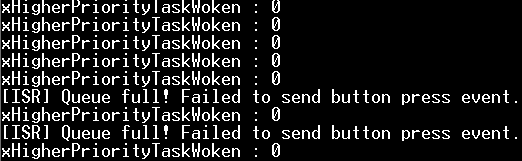 예제에서 portYIELD_FROM_ISR(xHigherPriorityTaskWoken)를 보면 xHigherPriorityTaskWoken가 pdTRUE여야만 portYIELD_FROM_ISR가 수행되는데 xQueueSendFromISR를 호출했을때 xQueueReceive에 따라서 pdTRUE가 되는지 확인해보겠습니다.
