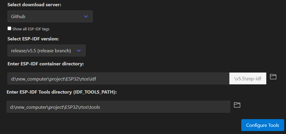 4. ESP-IDF container directory는 SDK이고 ESP-IDF Tools directory는 개발도구입니다. 경로를 정하고 Configure Tools를 클릭합니다.