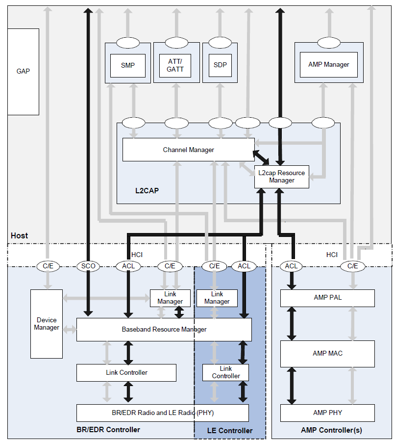 (2) Host는 소프트웨어 스택입니다. GAP(연결/페어링/역할관리) , GATT(서비스, characteristic 읽기/쓰기) , ATT(실제 읽기/쓰기 요청 수행), L2CAP (패킷 분할/재조립+multiplexing), SMP(Pairing,Bonding, key교환)가 여기에 속합니다.