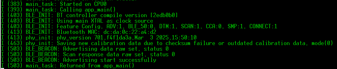 해당함수에서 이제 adv_config_done가 0이므로 esp_ble_gap_start_advertising를 하게되고ESP_GAP_BLE_ADV_START_COMPLETE_EVT 이벤트를 호출합니다. 그럼 로그(I (513) BLE_BEACON: Advertising start successfully)가 나오고 광고가 시작됩니다.