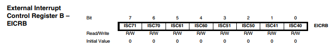 EICRA는 INT0~3을 결정하는 것이고 EICRB는 IN4~7를 결정하는 것입니다. 뭘 결정하냐면 바로 인터럽트가 어느시점에 걸리냐를 결정합니다.