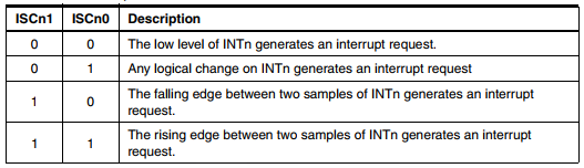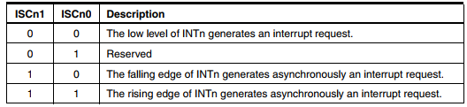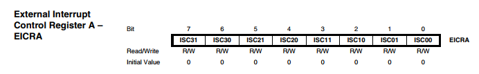 EICRA는 인터럽트 0~3번이 발생하는 시점을 결정하는 레지스터이고 조건은 3가지입니다.