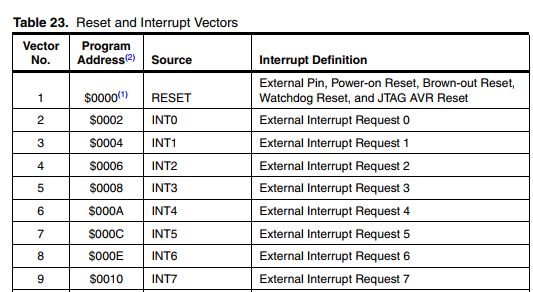 외부인터럽트는 8개가 있습니다. INT0~INT7까지있는데 INT0~INT3는 PD0~PD3을 사용하고, INT4~INT7은 PE4~PE7을 사용합니다.