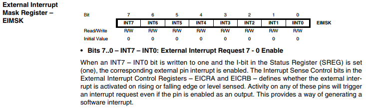 EIMSK(External Interrupt Mask Register) - INT0~INT7번까지 핀중에 사용할 핀을 SET 시켜줘야 그 핀을 외부인터럽트로 사용할 수 있게 됩니다.