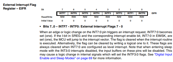 EIFR(External Interrupt Flag Register) - 인터럽트가 발생하면 해당핀이 1로 Set됩니다. 그 의미가 있는데 만약 외부인터럽트 INT0,INT1에서 인터럽트가 동시에걸렸으면 INT0부터 실행하게 됩니다.